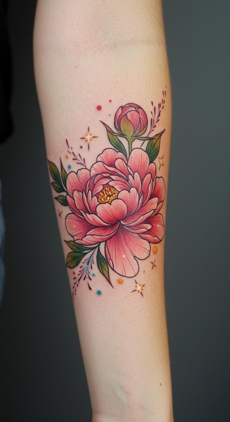 The fine line colored peony tattoo embodies love and beauty, making it a poignant symbol of femininity and individuality.