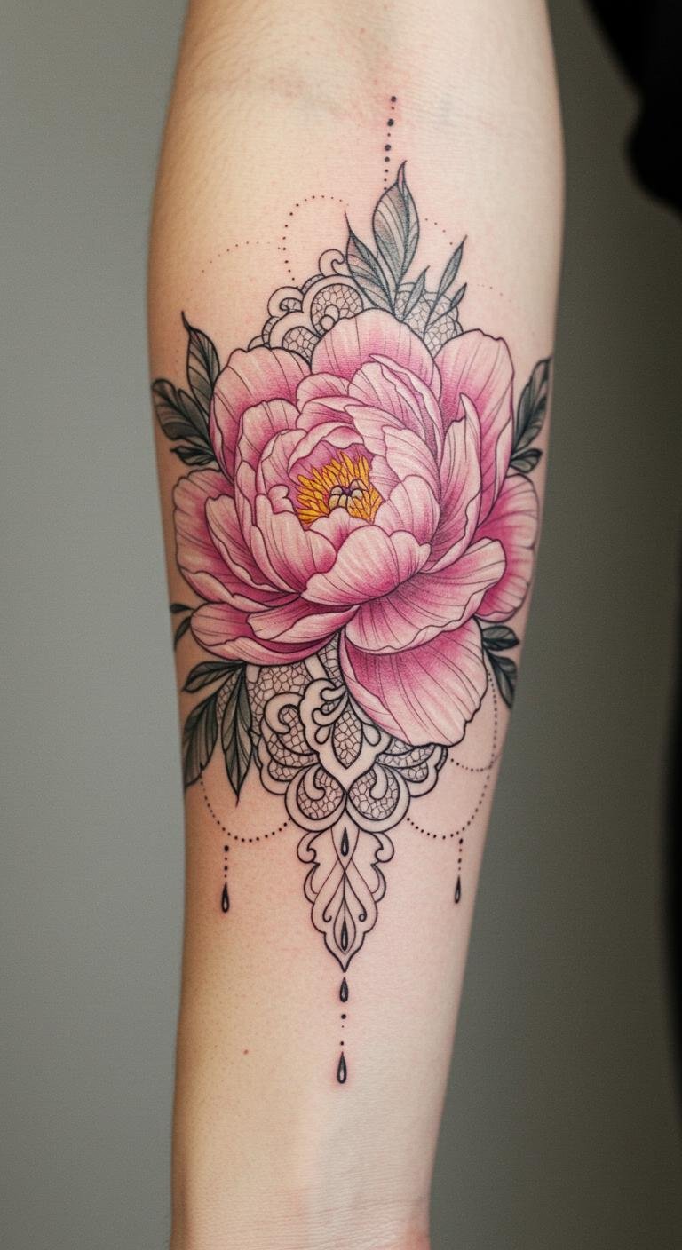 This tattoo design, elegantly placed on the forearm, symbolizes femininity and grace, harmoniously blending the beauty of peonies with intricate lace.
