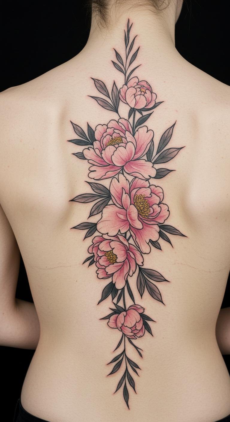 The placement along the spine enhances the sense of movement and elegance, allowing the design to flow with the body’s natural curves.