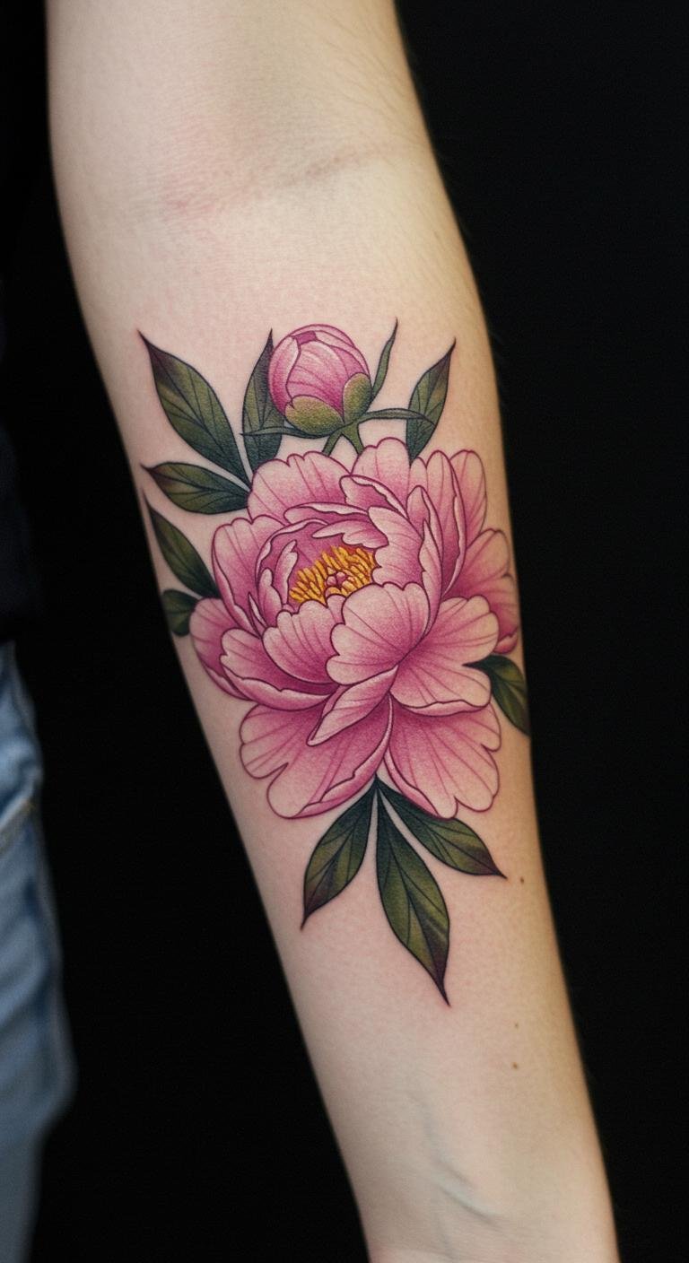 The peony, often associated with romance and prosperity, serves as a reminder of growth and resilience, making this tattoo not just an art piece, but a personal emblem of strength and elegance.