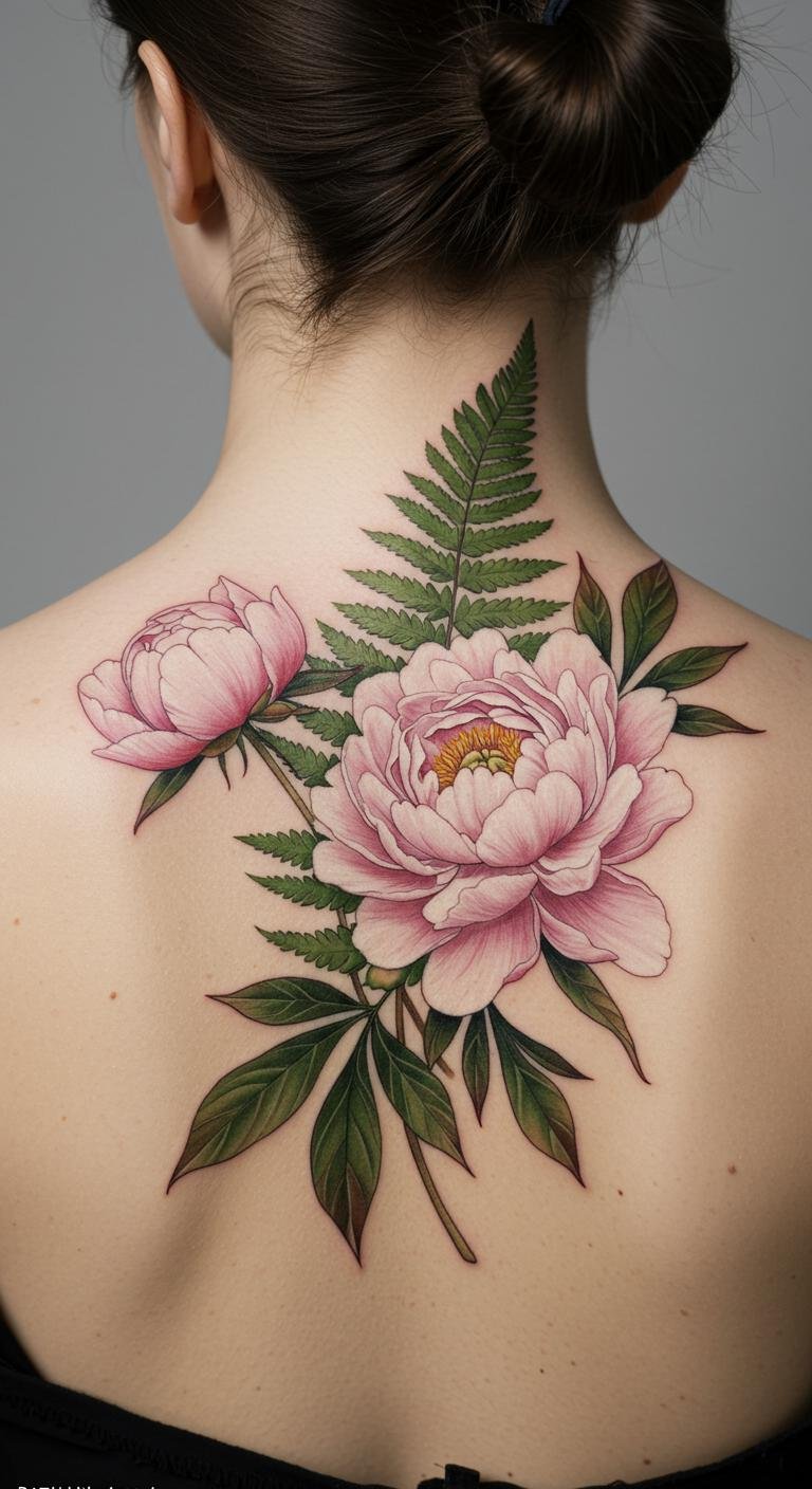 The peony symbolizes love and grace, while the fern embodies strength and sincerity, creating a perfect balance.