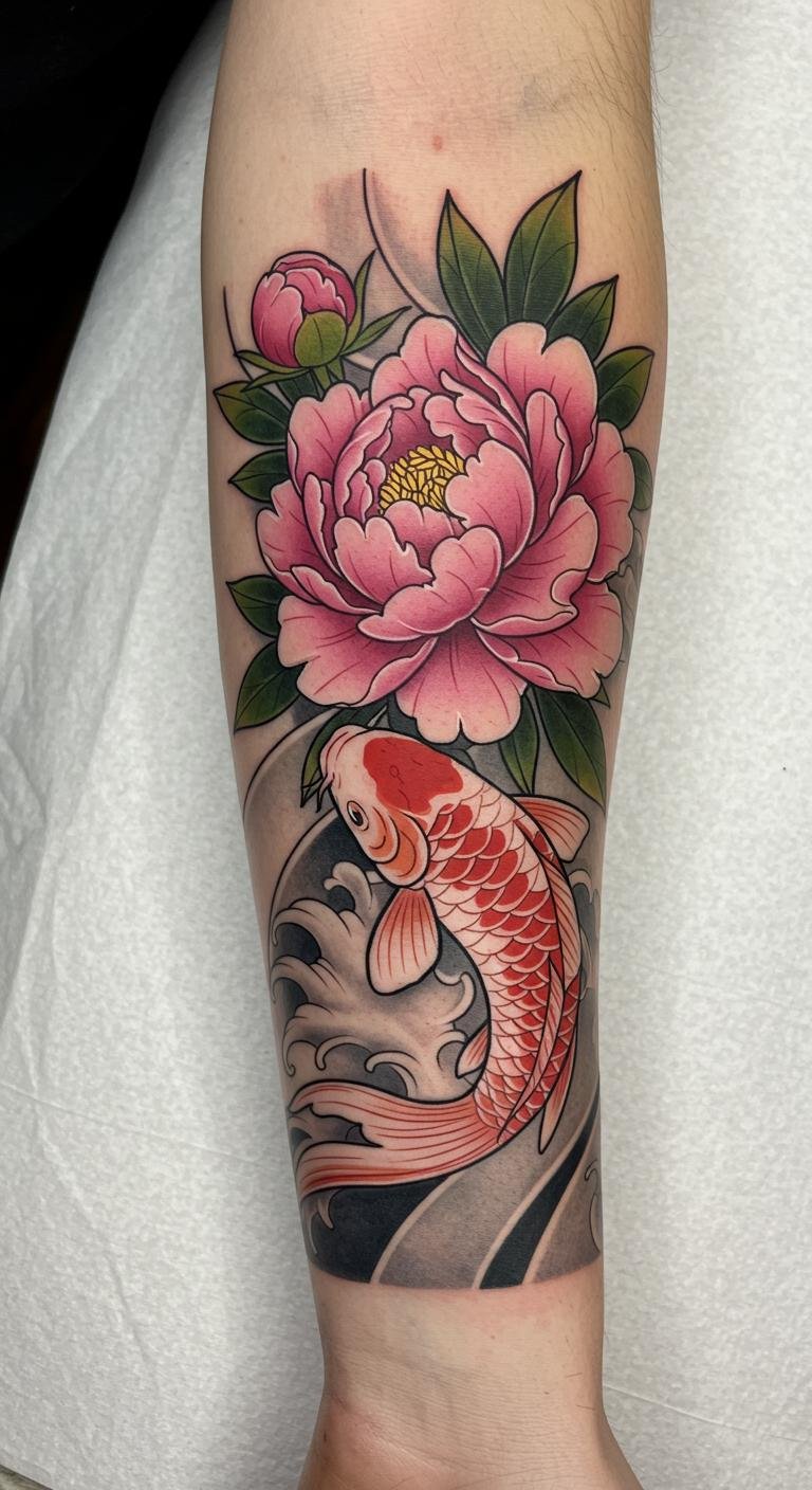 The peony symbolizes beauty and prosperity, while the koi fish represents resilience and transformation, making this tattoo a powerful emblem of strength and grace.