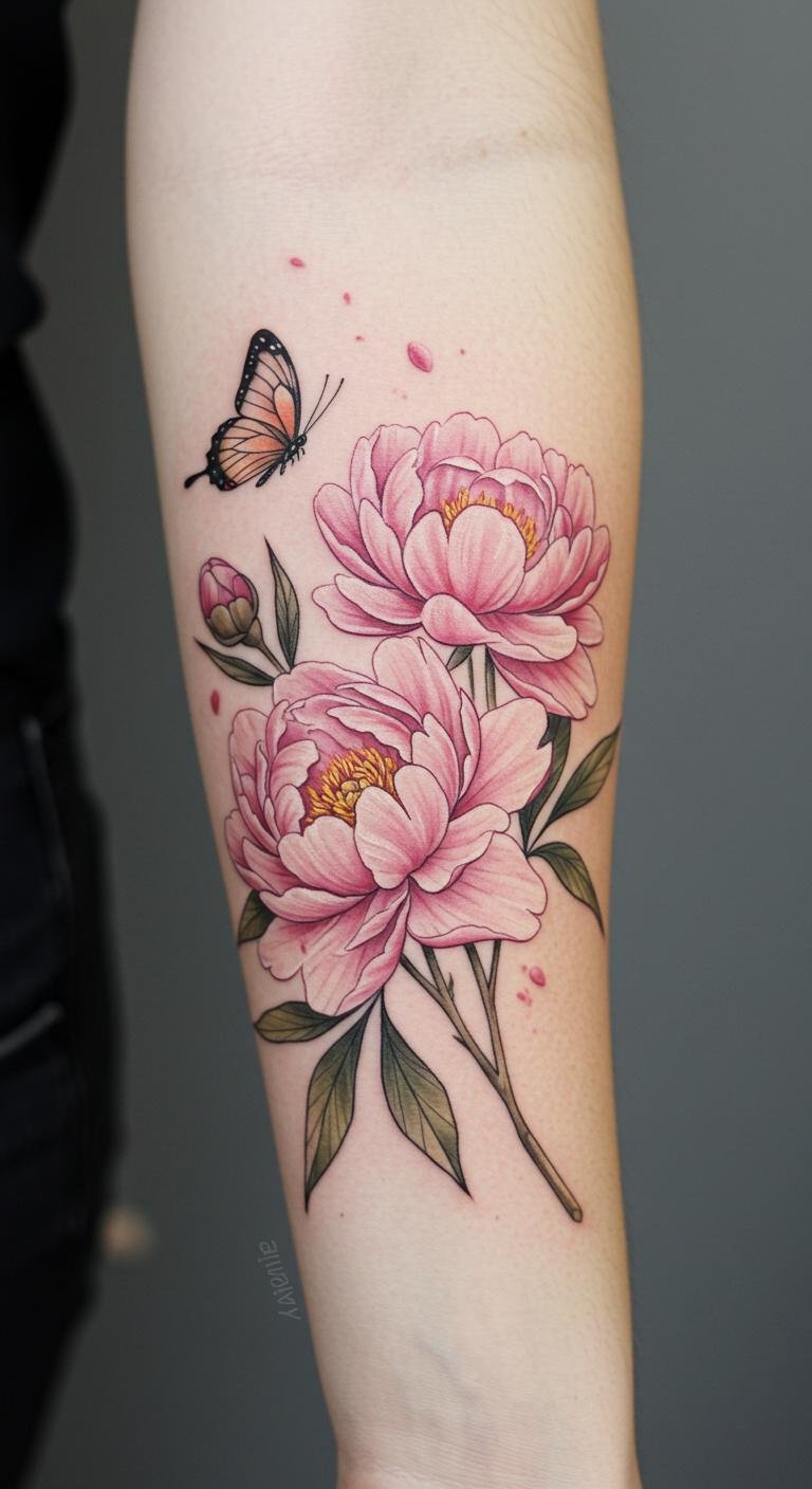 The tattoo on the forearm eloquently intertwines the symbolism of the peony, representing prosperity and romance, with the butterfly, embodying transformation and freedom.