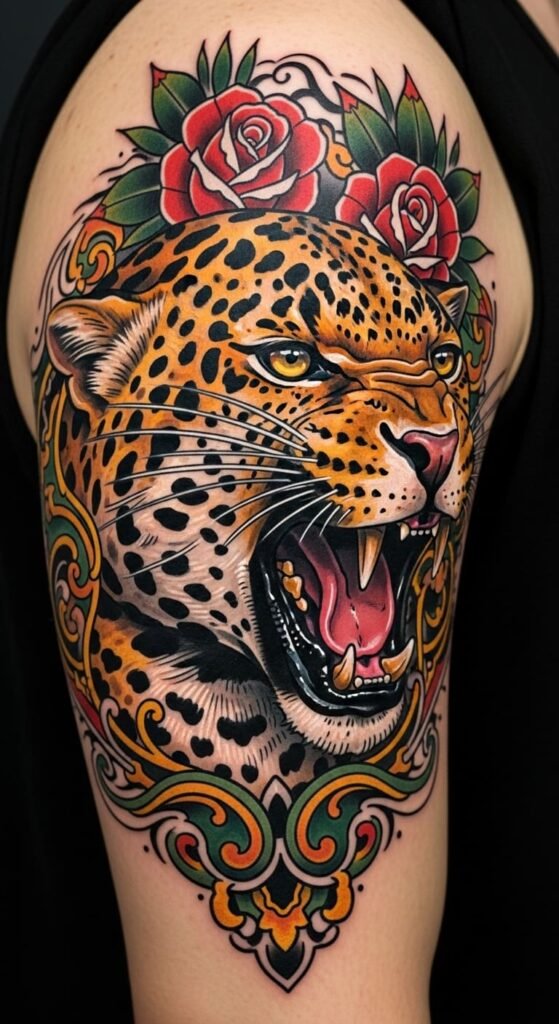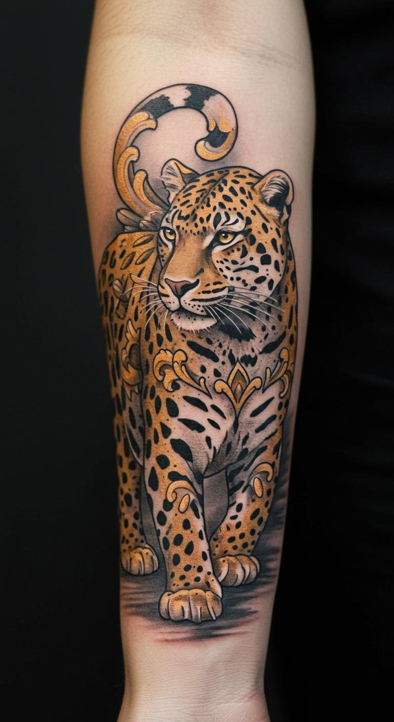 This tattoo symbolizes the balance between strength and beauty, embodying the fierce spirit of the leopard while showcasing the delicate artistry of ornamental design.