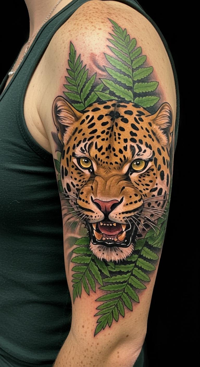 This tattoo symbolizes strength and the untamed spirit of the wild, with the leopard representing courage and ferocity, while the ferns evoke a sense of growth and connection to nature.