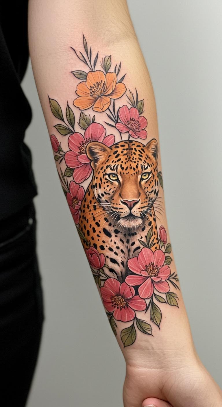 The Floral Leopard Tattoo symbolizes the union of strength and femininity, with the leopard representing a wild spirit and the flowers embodying growth and passion.