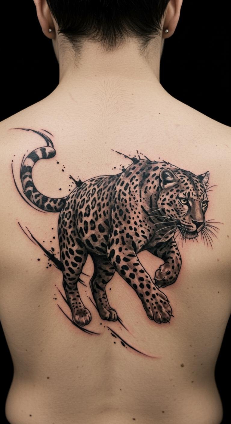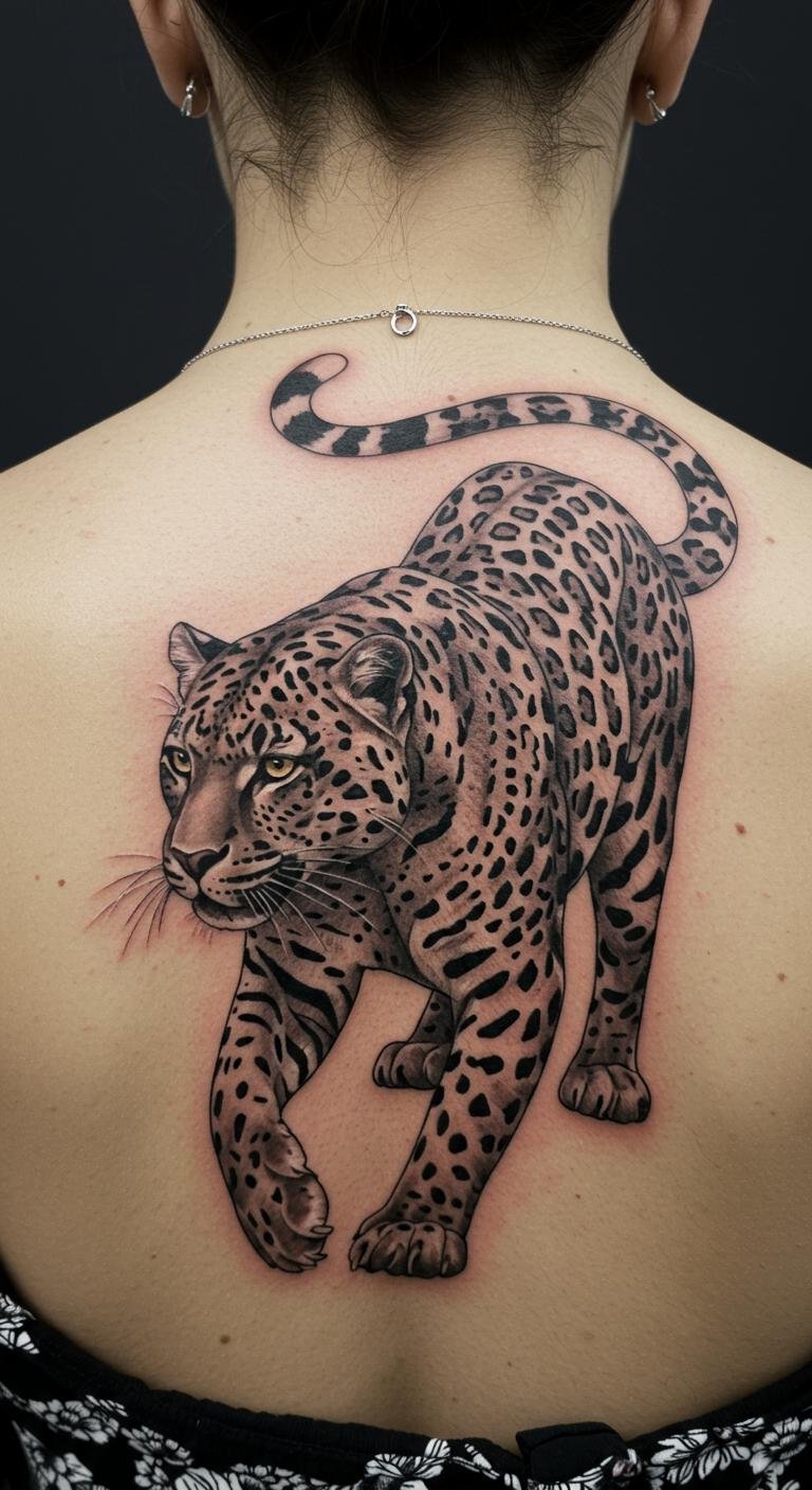 Positioned on the upper back, it allows for a large canvas that emphasizes the leopard’s grace and power, making it a stunning piece of art.