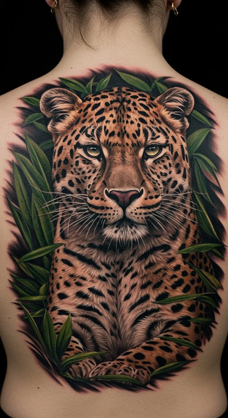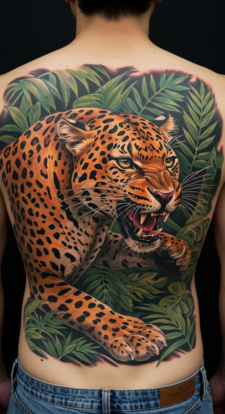 Hyper-Realistic Jungle Leopard Back Tattoo