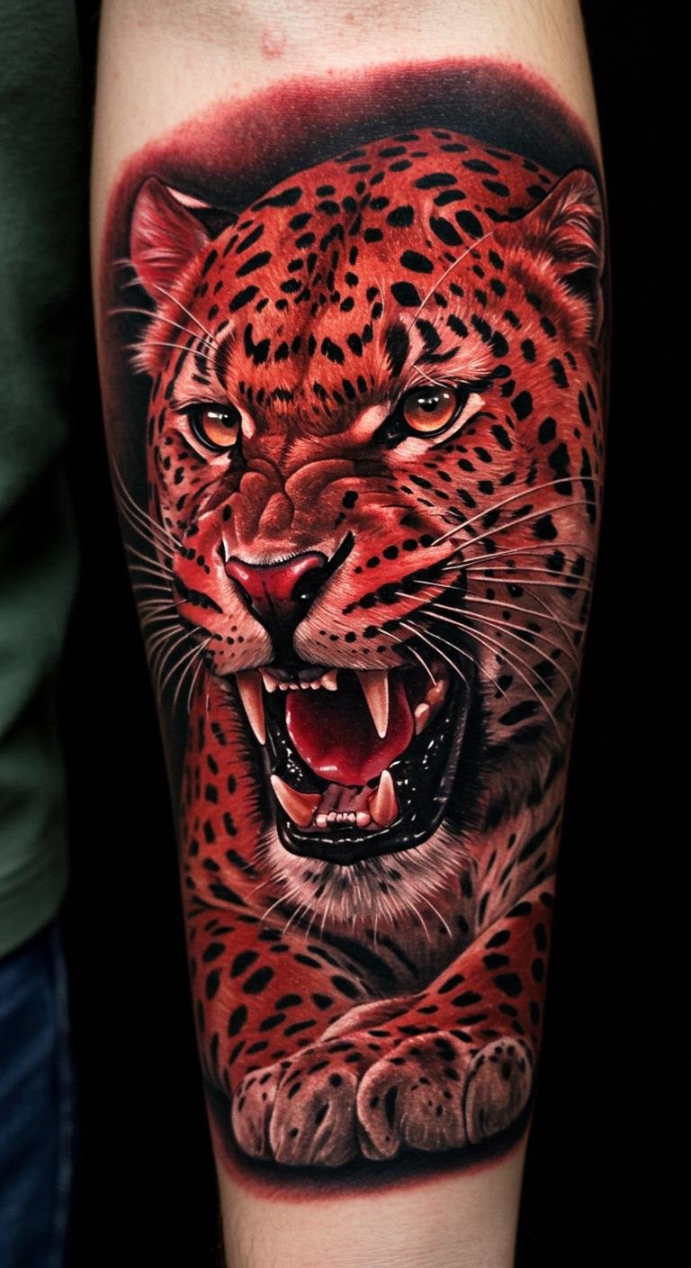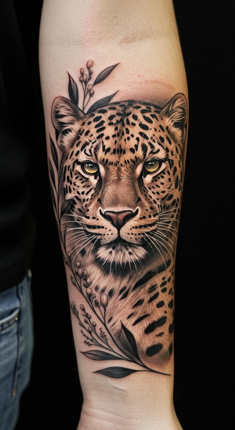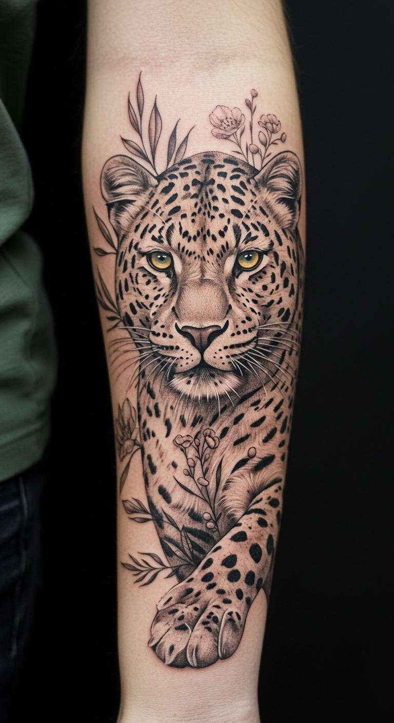 This leopard tattoo symbolizes strength, freedom, and a deep connection to the wild. Placed on the forearm, it serves as a constant reminder of one’s inner power and resilience. The intricate details not only enhance the natural beauty of the skin but also tell a story of individuality and fierce independence, allowing the wearer to express their unique spirit every time they glance at it.