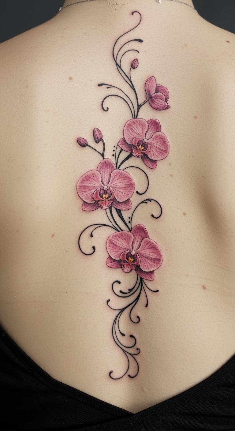This orchid vine tattoo symbolizes beauty, strength, and resilience, reflecting the wearer’s journey through life’s challenges. Its placement along the spine emphasizes a connection to one’s backbone, representing support and stability. The graceful flow of the design not only enhances the body’s natural curves but also serves as a reminder of personal growth and the blossoming of one’s true self. This tattoo is a perfect choice for those seeking a meaningful piece that beautifully blends art and personal significance.