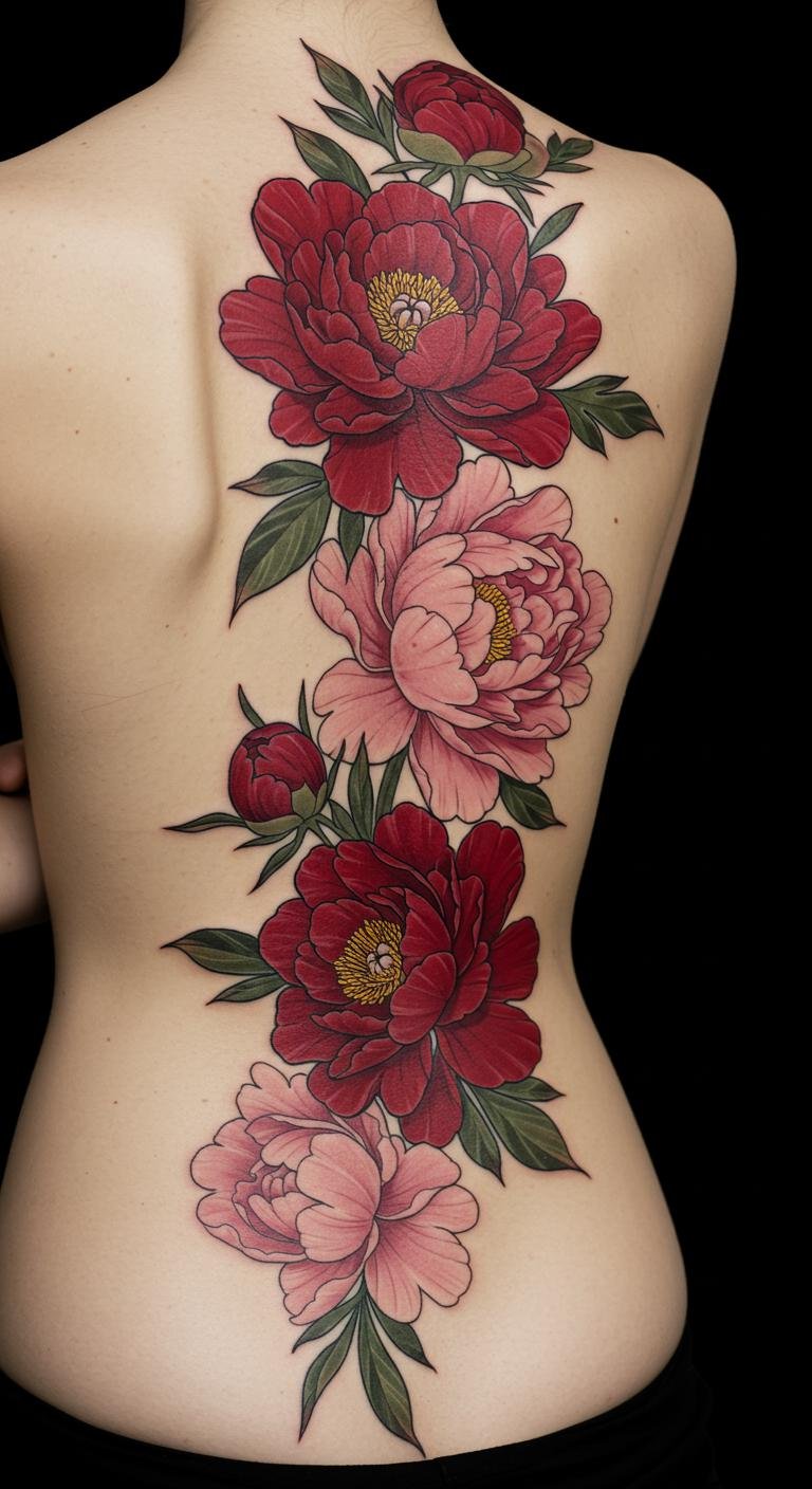 The peonies in this tattoo symbolize love and resilience, reflecting deep personal significance for the wearer.