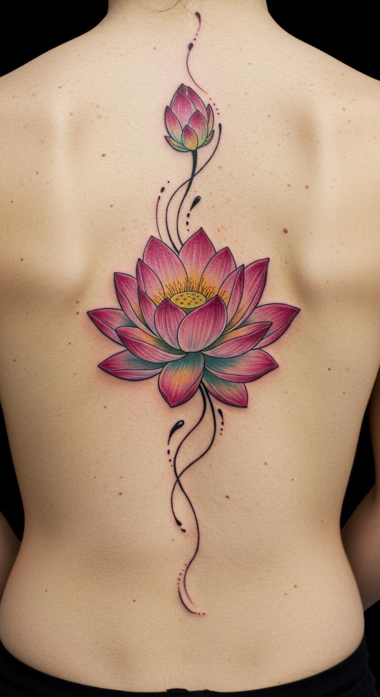 Symbolizing purity and enlightenment, the lotus blossom tattoo along the spine offers a stunning reminder of one’s journey towards self-discovery.