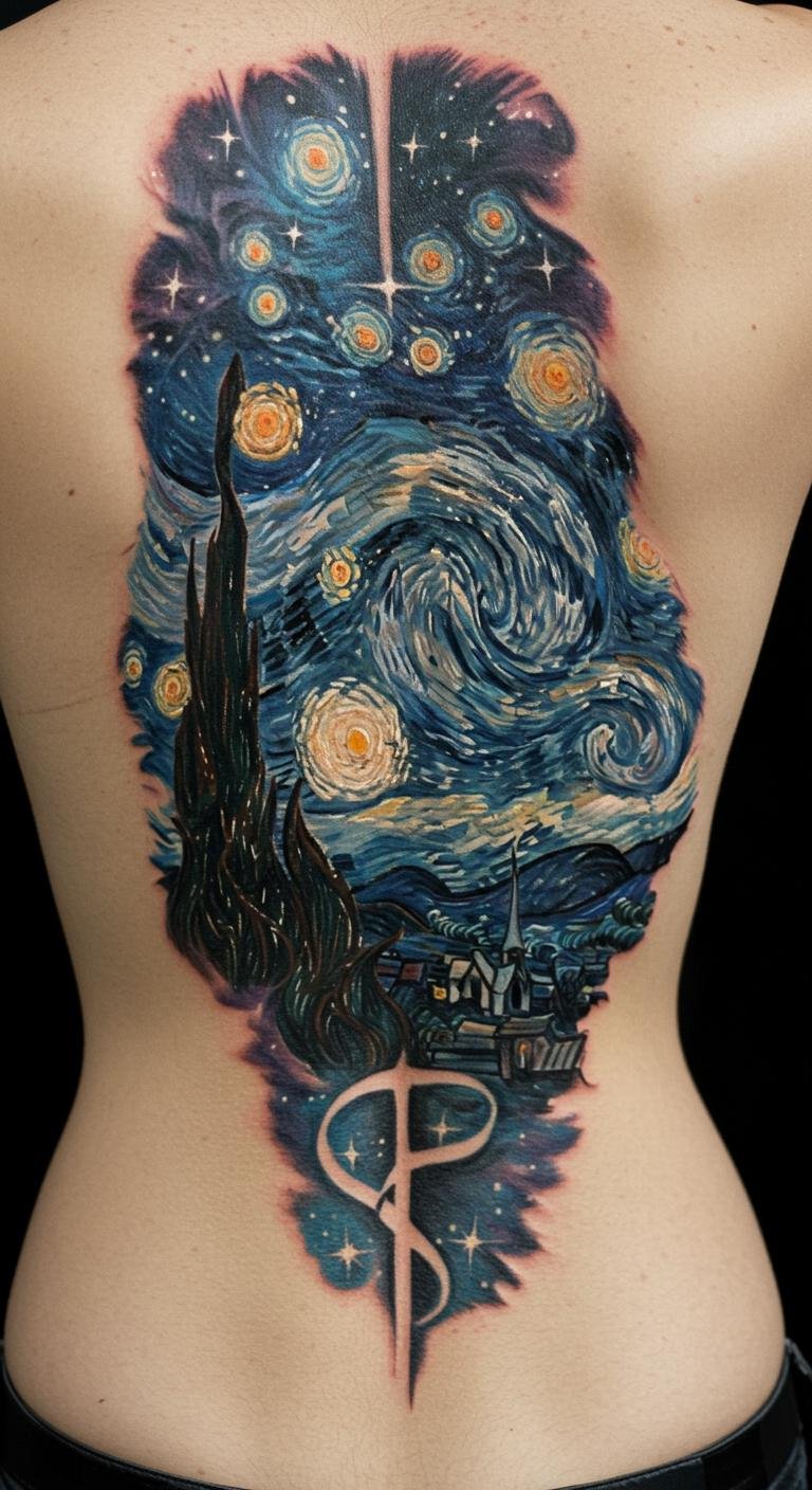 This spine tattoo symbolizes a journey through the cosmos, inviting the wearer to explore their dreams and aspirations.