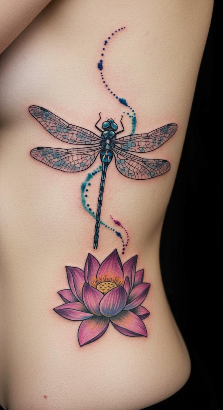 Transformative beauty unfolds with the Dragonfly and Lotus Spine Tattoo, a stunning fusion that captures the essence of nature’s elegance. The dragonfly symbolizes change and freedom, while the lotus represents purity and enlightenment.