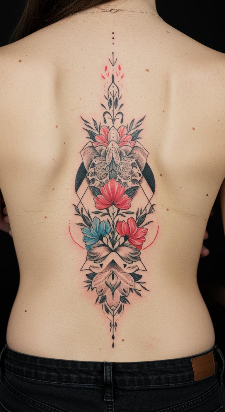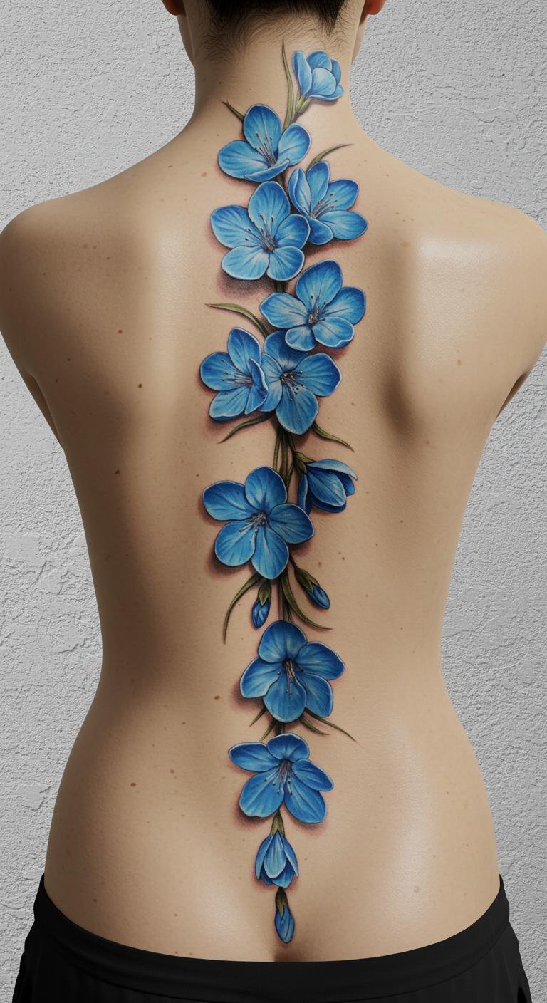 The placement along the spine emphasizes the connection between body and nature, making it a stunning representation of one’s unique journey while accentuating the body’s natural lines and contours.