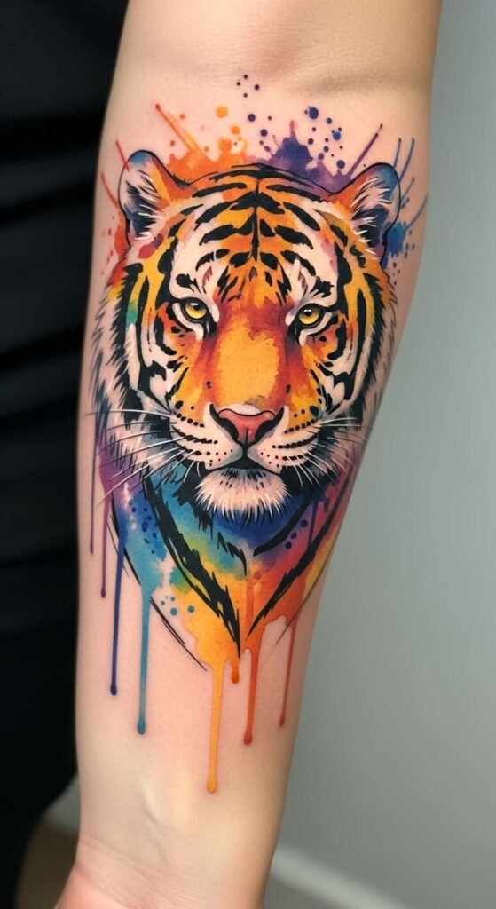 This Watercolor Tiger tattoo on the forearm symbolizes strength and freedom, perfectly capturing the fierce essence of the tiger.