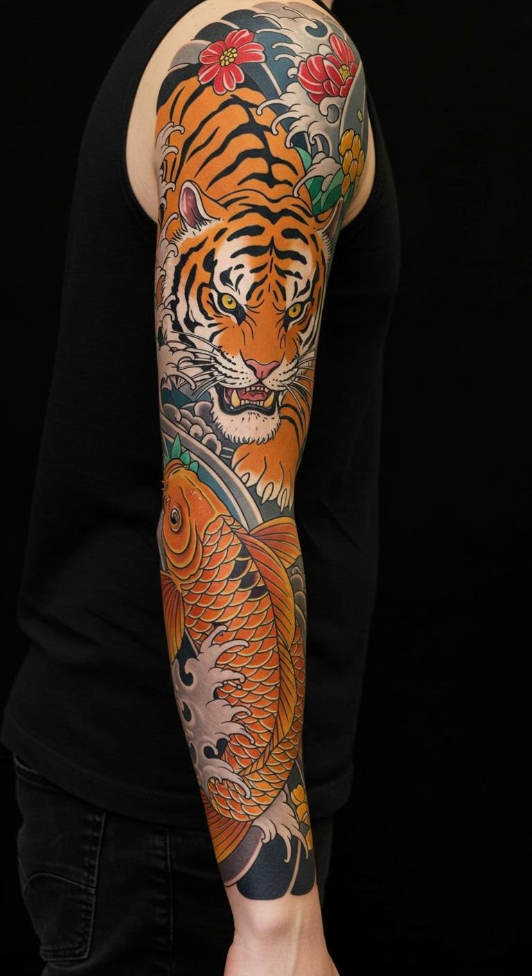 Japanese Tiger and Koi Fish Full Sleeve Tattoo