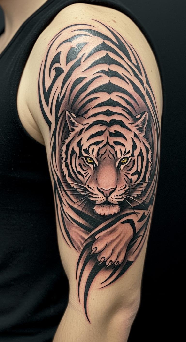 This fierce tiger shoulder tattoo symbolizes strength and resilience, embodying the wild spirit of those who wear it.