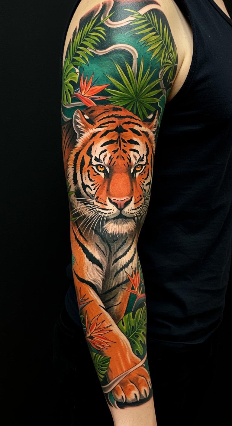 The Autumn Tiger Sleeve Tattoo embodies the powerful themes of strength and resilience, with the tiger symbolizing courage in the face of change.