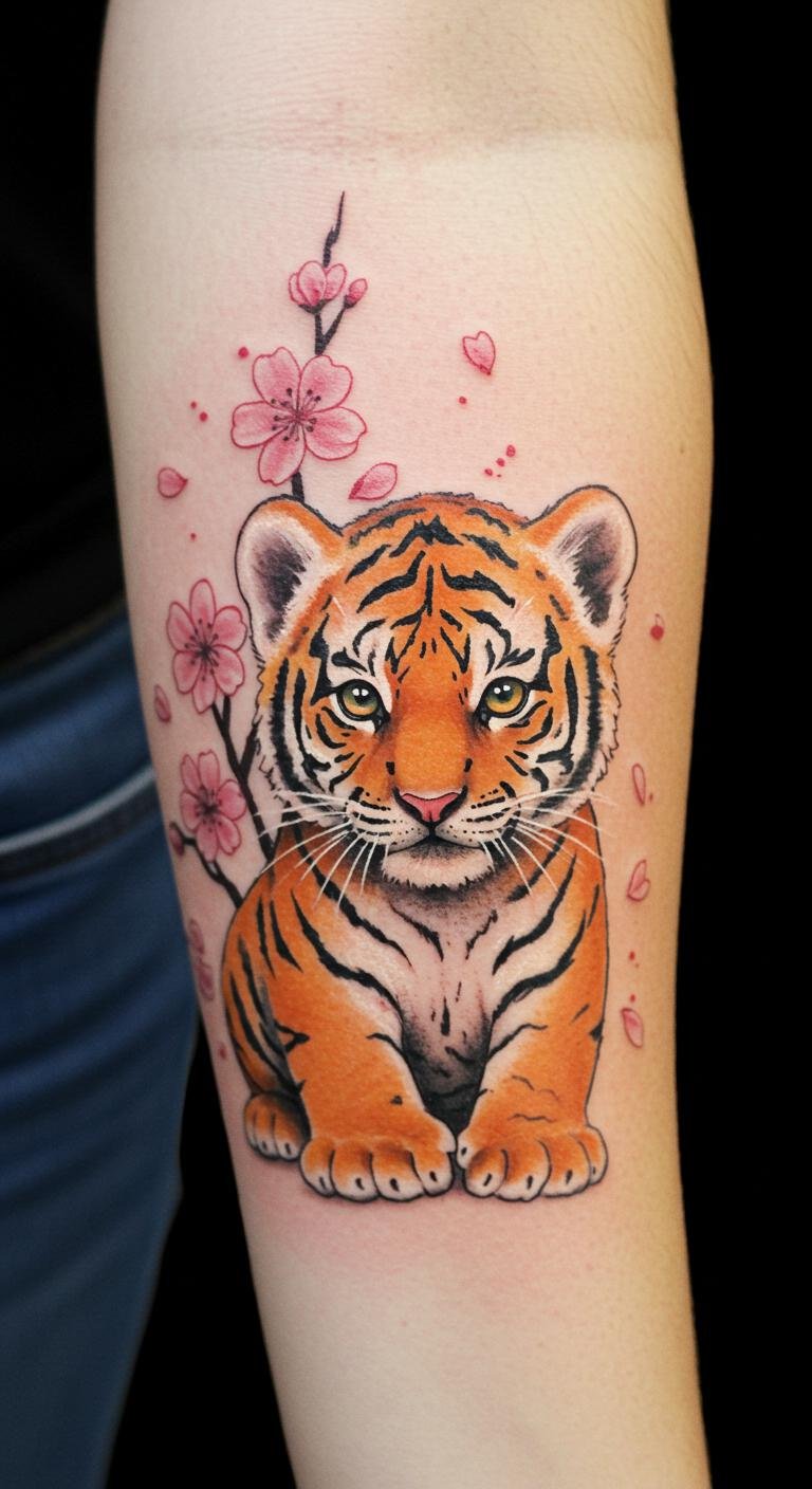 The playful baby tiger symbolizes the fierce spirit within, while the cherry blossoms represent beauty and renewal. Together, they evoke a sense of freedom and wild beauty, making this design not just an adornment but also a personal emblem of resilience and youthful spirit.