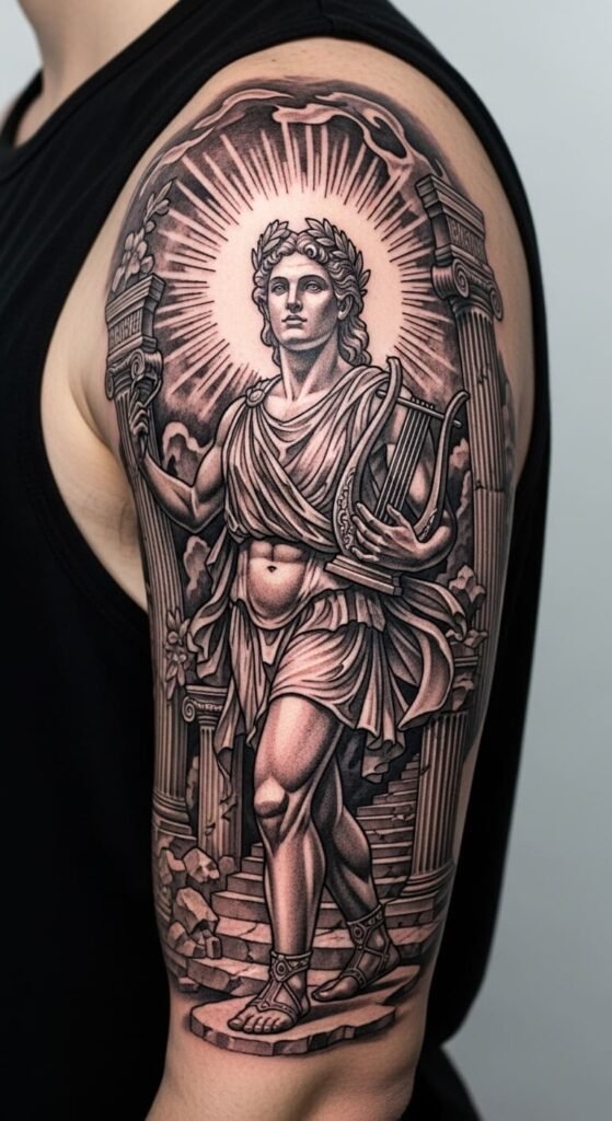 This tattoo of Apollo, the Greek god of music and poetry, serves as a powerful symbol of creativity and inspiration.