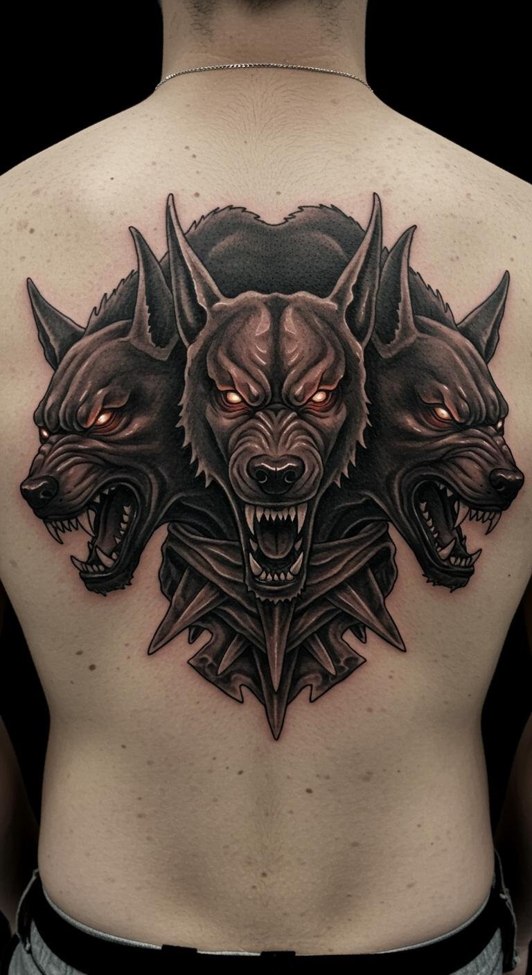This Cerberus tattoo symbolizes loyalty and fierce protection, embodying the spirit of a steadfast guardian.