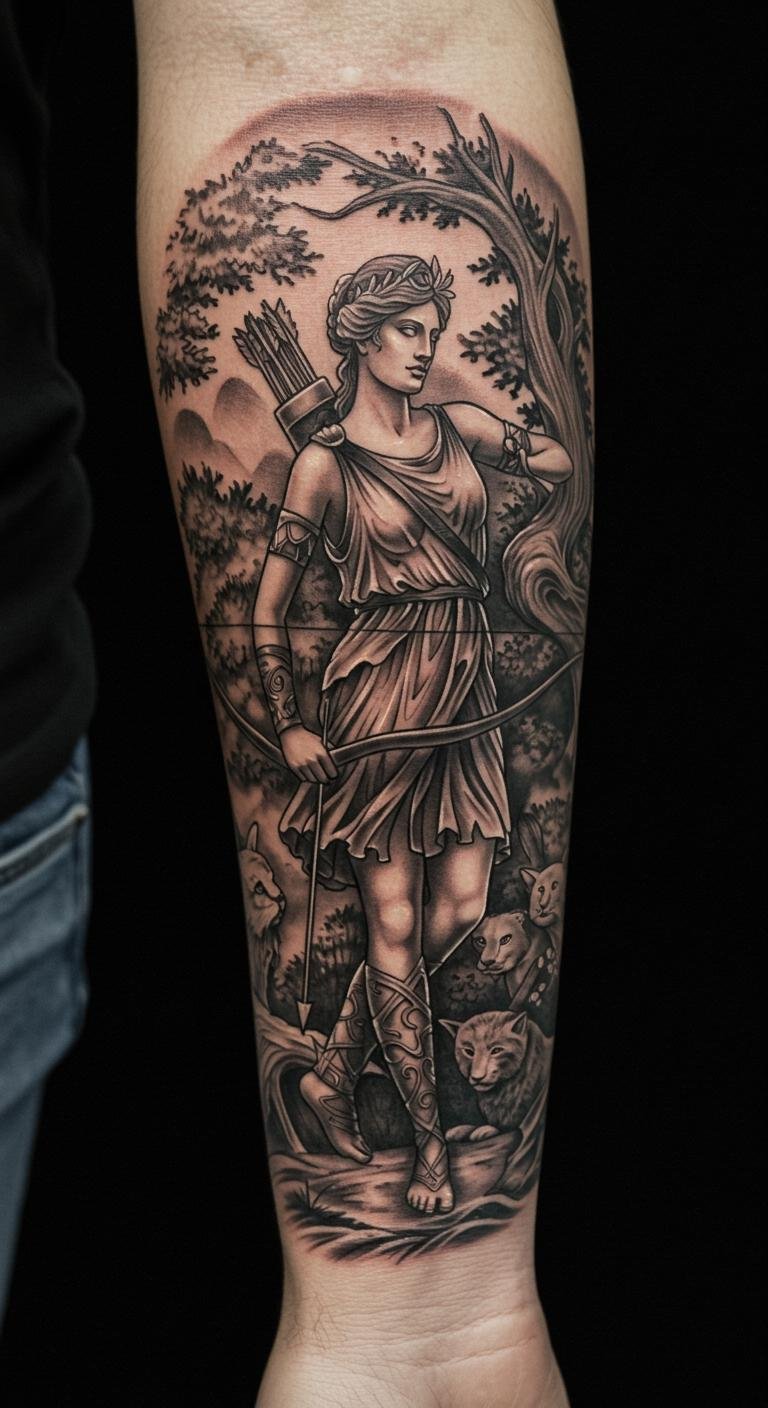 The tattoo symbolizes the spirit of the hunt, embodying Artemis’s grace and strength as a goddess.