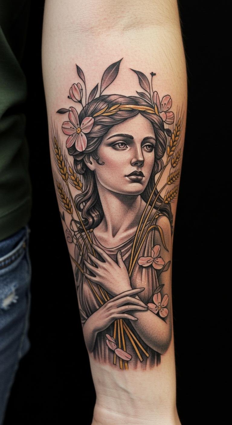 This tattoo beautifully embodies the spirit of Demeter, symbolizing abundance, fertility, and the nurturing aspects of nature.