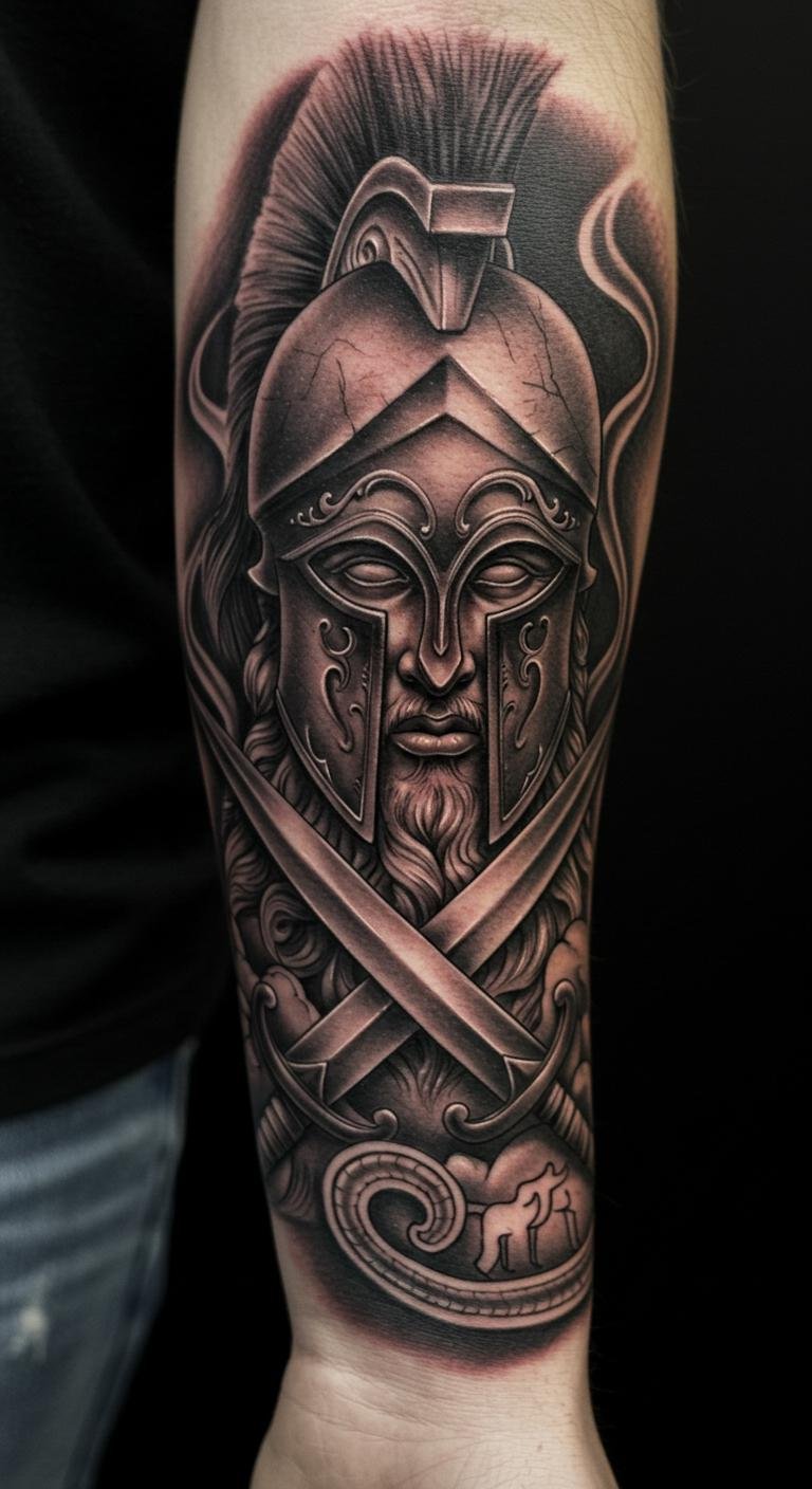 This tattoo embodies the essence of Ares, merging powerful combat imagery with themes of heroism and strength.