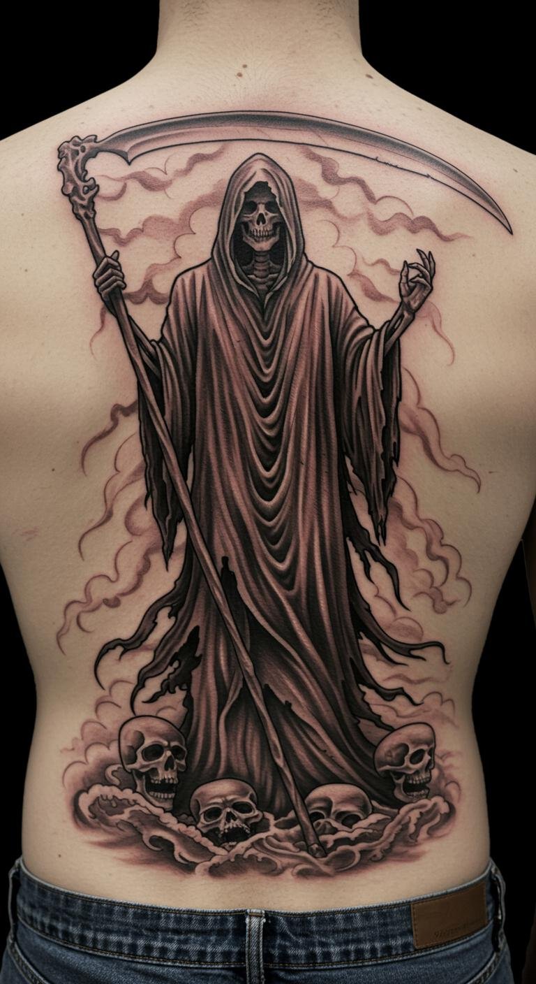 The placement on the upper back allows for both visibility and discretion, making it a personal yet expressive piece. The skeletal figure, adorned in flowing robes, symbolizes the inevitability of death, while the ethereal wisps around it evoke the mystery and beauty that accompanies the end of life.