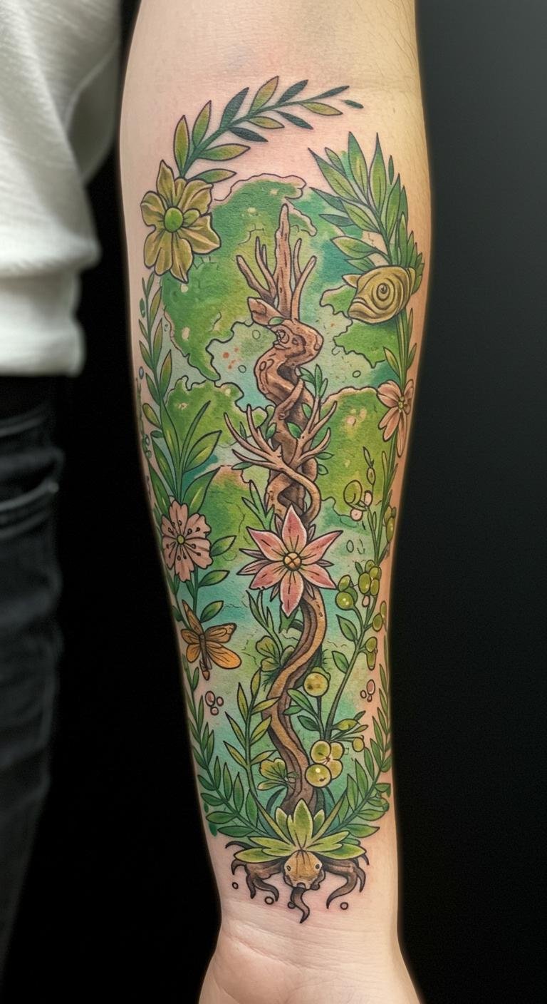 The design flows beautifully with the contours of the arm, creating a dynamic connection between the tattoo and the wearer, celebrating the beauty of life and the freedom found in our relationship with the earth.