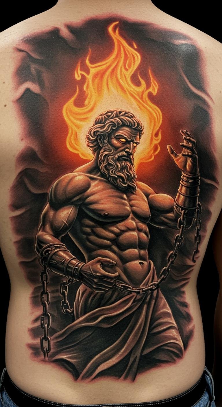 Placed on the upper back, it serves as a powerful reminder of the eternal struggle for freedom and the sacrifices made for progress, allowing the wearer to carry this profound mythological narrative with them.