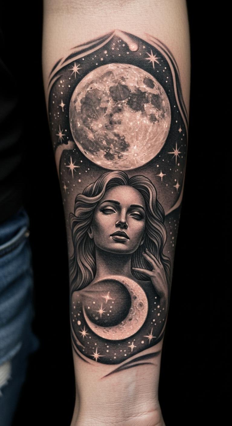 Positioned on the forearm, it creates a striking visual that can be easily admired, serving as a constant reminder of the enchanting power of the moon and its guiding light in times of uncertainty.