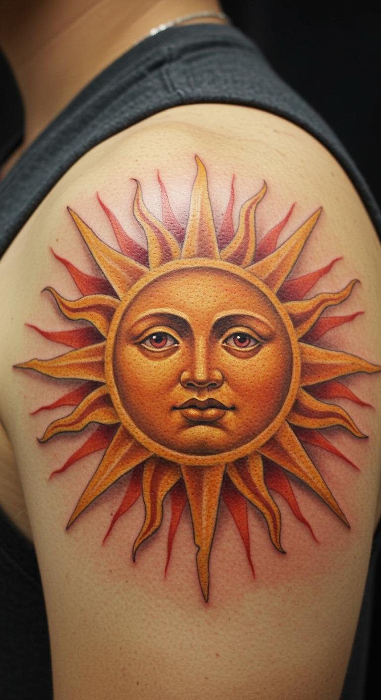 This tattoo symbolizes the power and energy of the sun, representing enlightenment, vitality, and the eternal cycle of life.