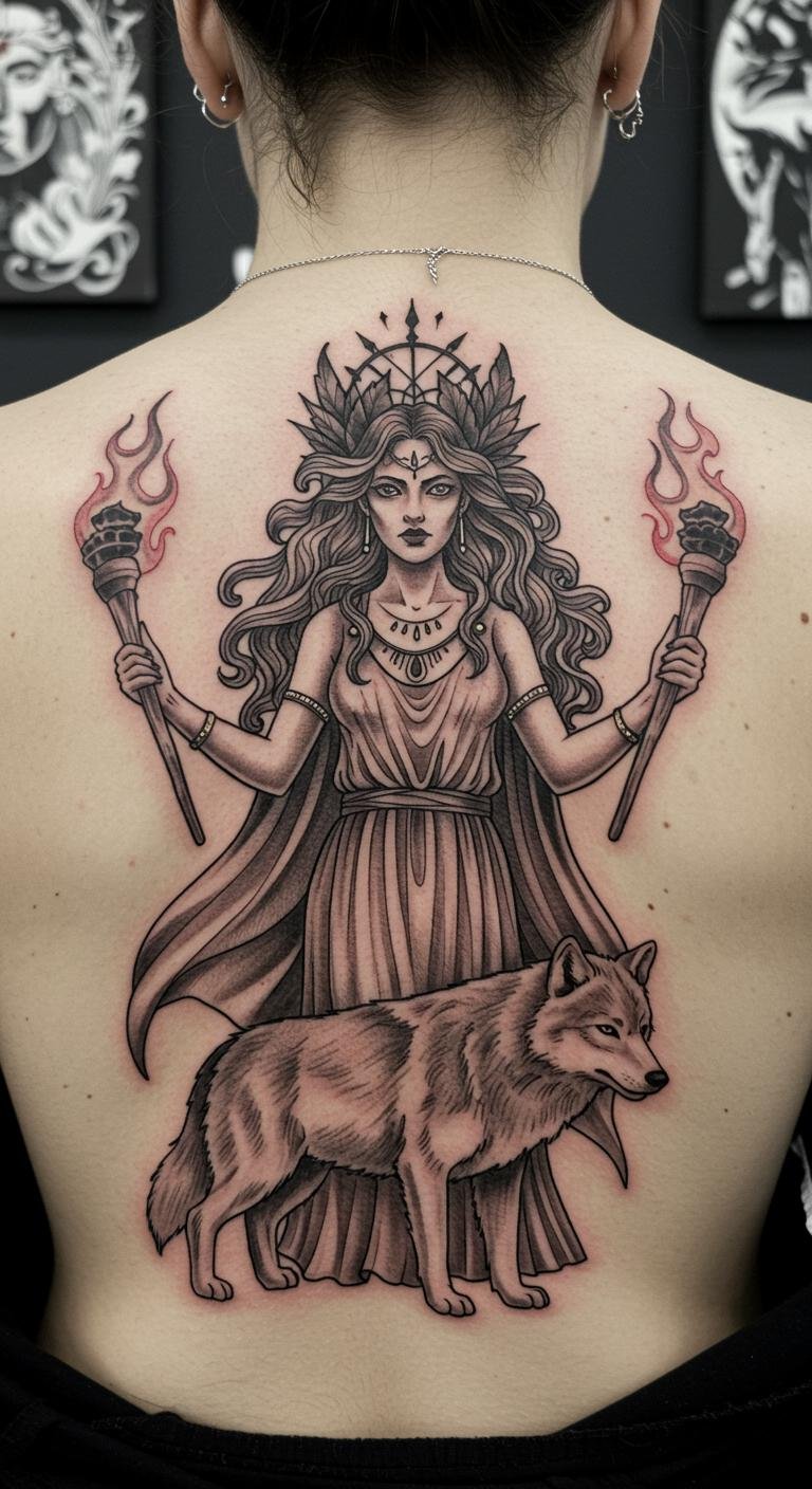 This tattoo represents the profound connection to the mystical realm, with Hecate symbolizing feminine power and protection.
