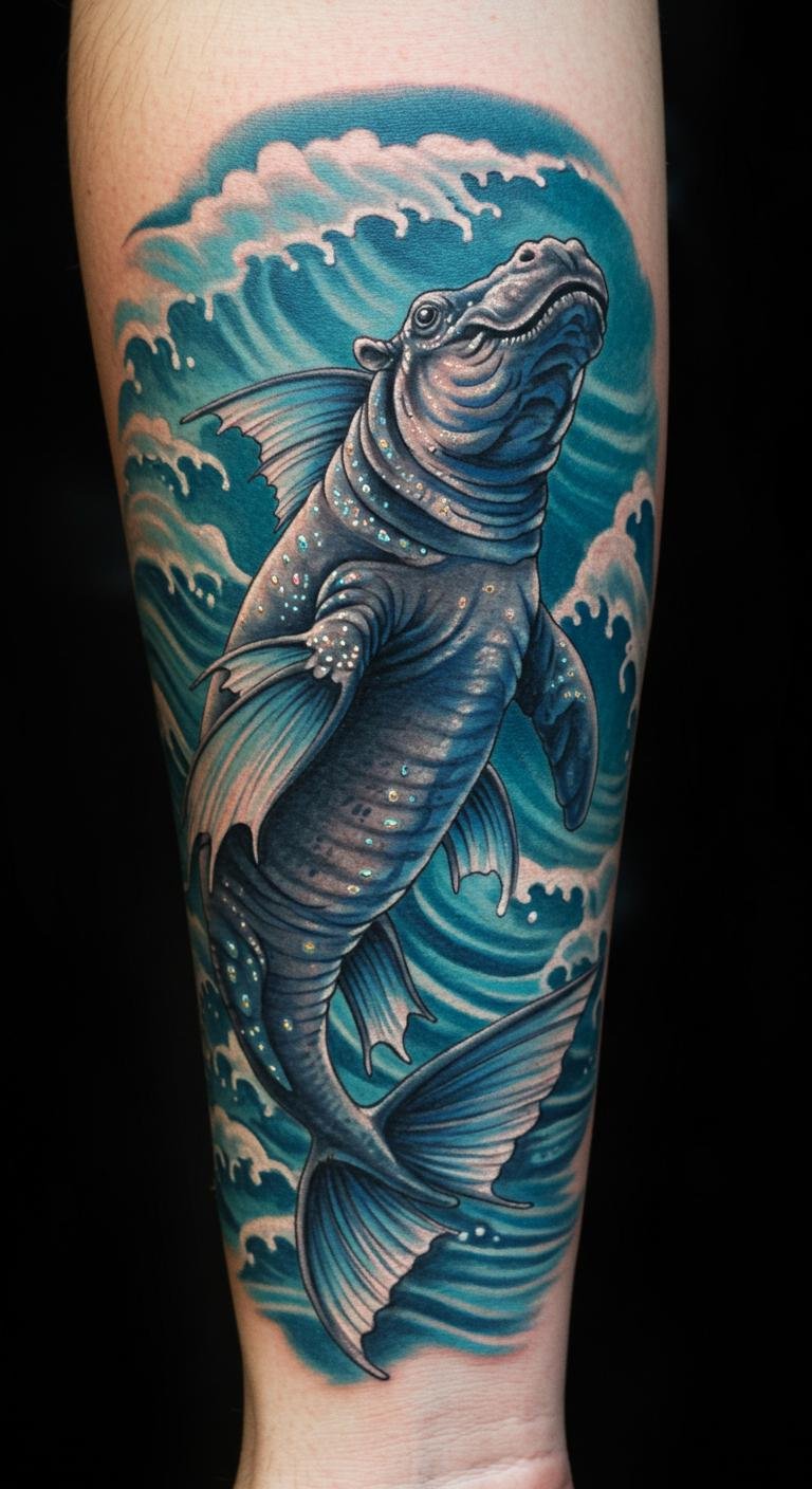 This tattoo symbolizes the harmony between grace and power, reflecting the mythical qualities of the hippocampus and its deep connection to the ocean.