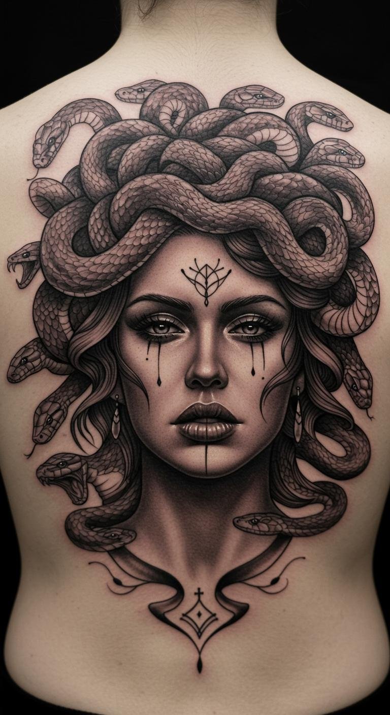 The placement on the upper back allows for a larger canvas, where the detailed artistry of Medusa can be fully appreciated.