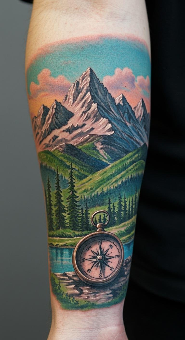 The mountain scene symbolizes the heights of your shared experiences, while the compass represents the direction and guidance in your journey together.