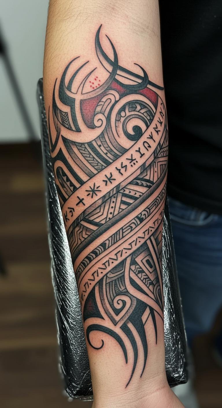 This tattoo embodies unity through its interwoven geometric forms, reflecting the strength and connection between a father and son.