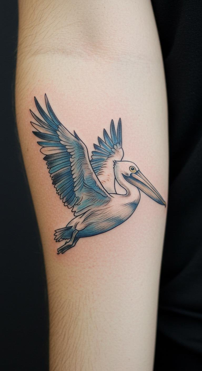 This Fine Line Pelican Tattoo embodies elegance and grace, capturing the essence of freedom and artistry. Positioned on the forearm, it becomes a visible reminder of the beauty of nature and the symbolism of resourcefulness and nurturing associated with pelicans.