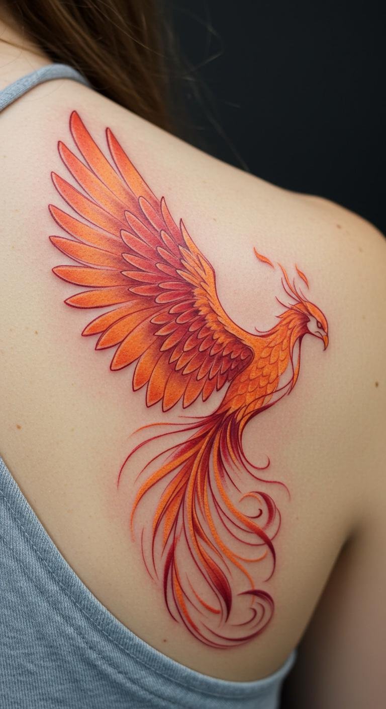 Positioned on the shoulder blade, it serves as a reminder of one’s inner strength and freedom, allowing the phoenix to inspire and uplift the spirit every day.