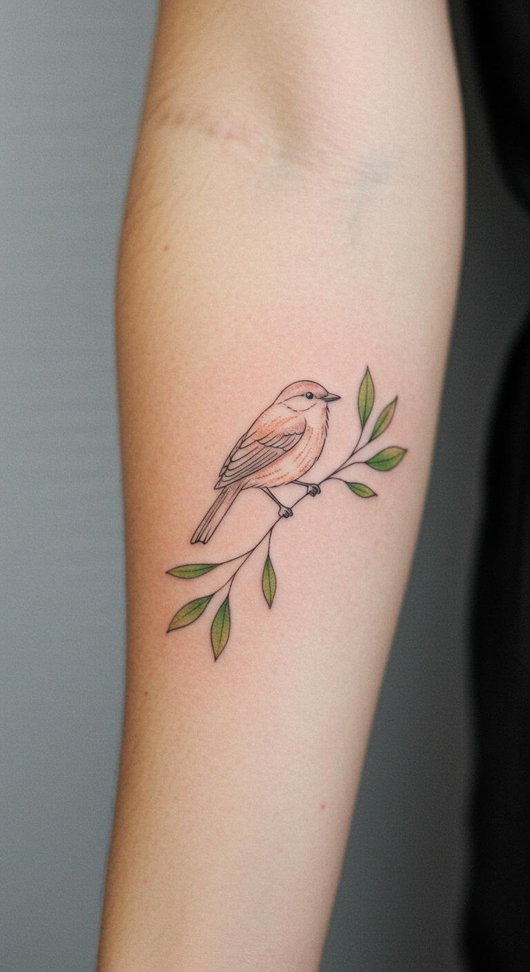 Fine Line Bird on Branch Tattoo