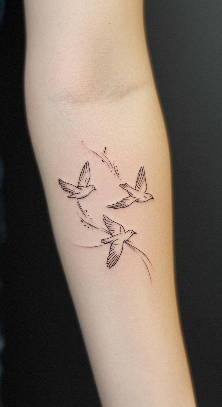 Each bird in this exquisite fine line tattoo represents freedom and grace, capturing the essence of liberation as they soar through the air.