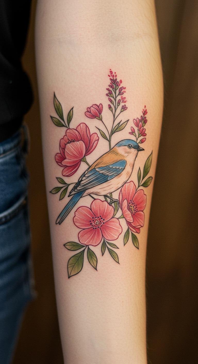 This tattoo design symbolizes freedom and joy through the bird, while the flowers represent growth and beauty.