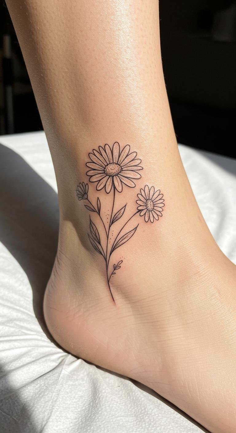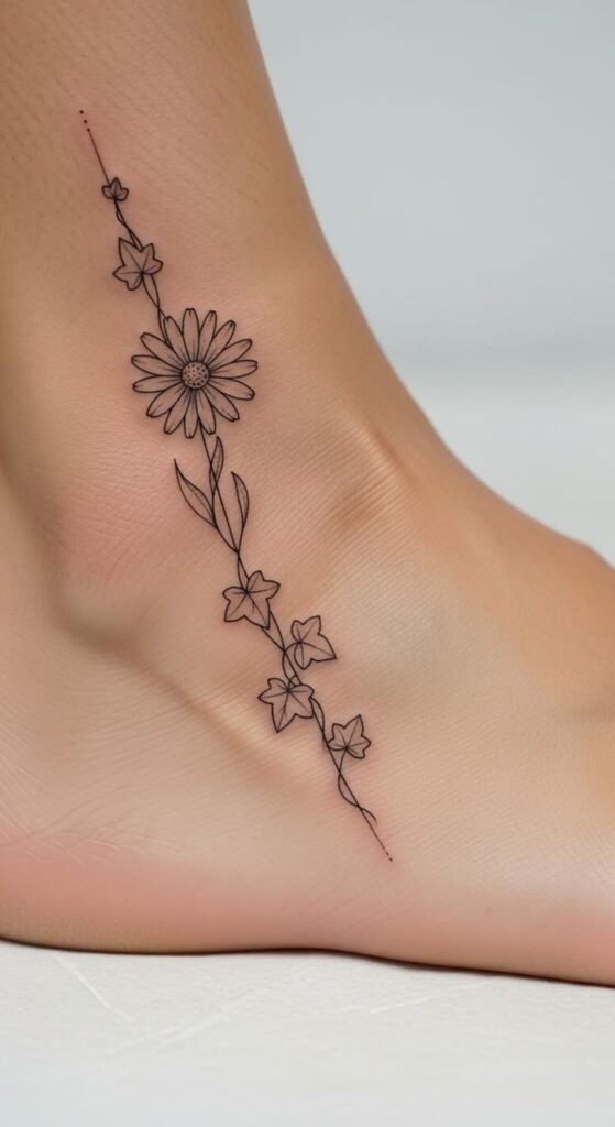 The fine line daisy foot tattoo symbolizes purity, innocence, and new beginnings, embodying a sense of freedom and connection to nature.
