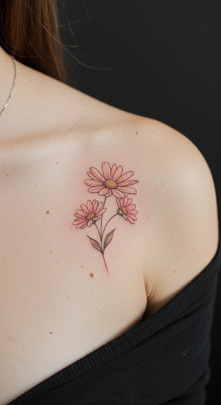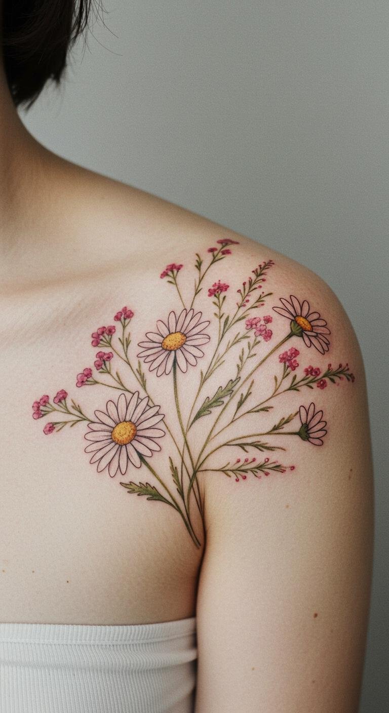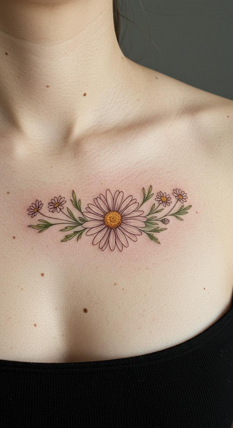 The shoulder and collarbone placement not only accentuates the natural curves of the body but also allows for an expression of freedom and femininity. Each daisy represents new beginnings and positivity, making it an ideal choice for anyone looking to celebrate their connection to nature and embrace their inner strength.