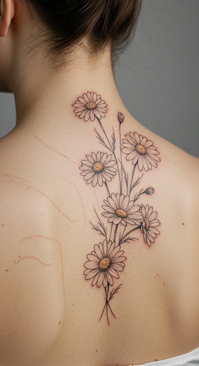 The upper back placement of the fine line daisy tattoo symbolizes strength and beauty, harmonizing with the wearer’s natural form.