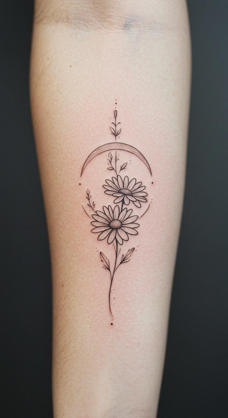 This enchanting design symbolizes the interplay between nature and the cosmos, embodying dreams and intuition through the crescent moon while the daisy represents grounded joy.