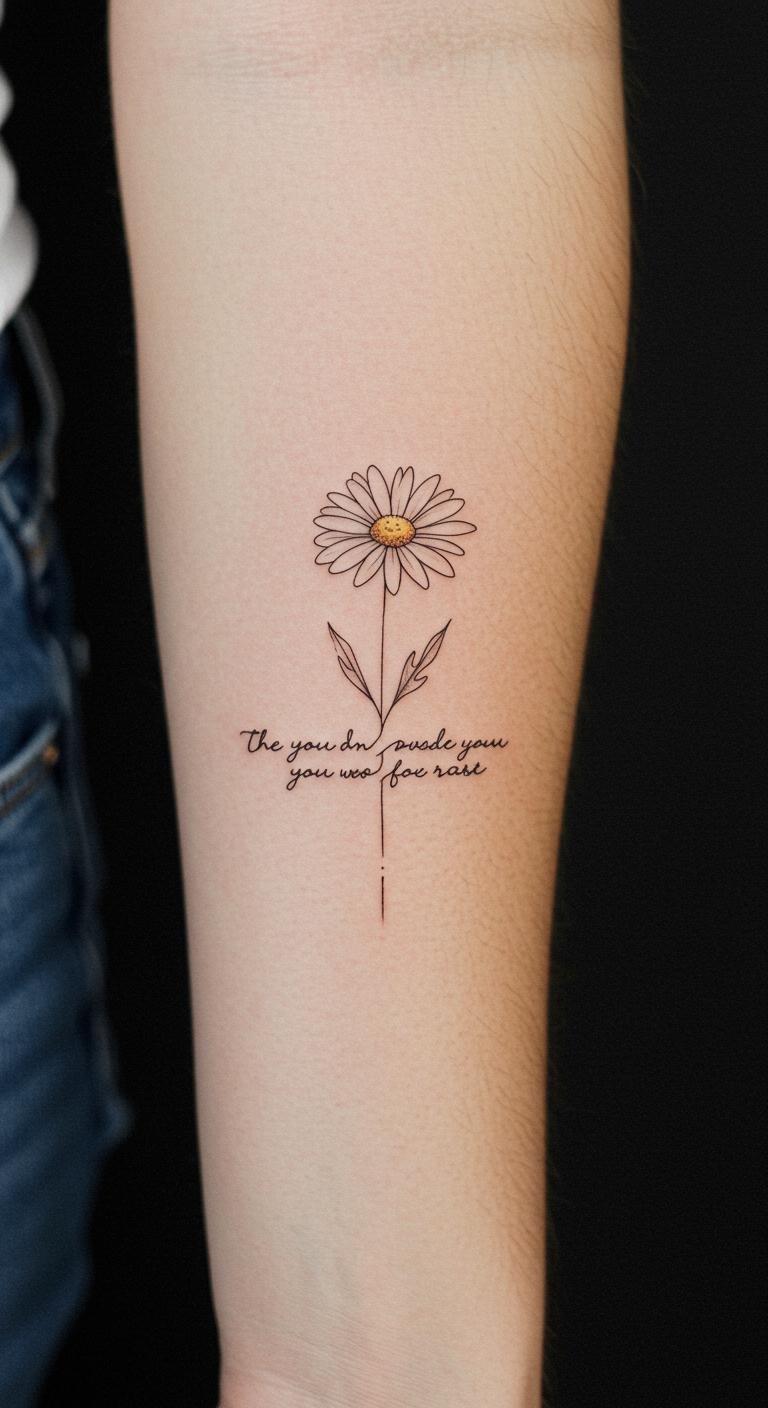 The combination of the daisy’s elegance and the meaningful words creates a narrative of strength and freedom, making it a deeply personal piece of art etched on the skin.