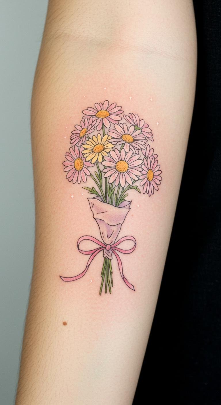 Placed on the forearm, it serves as a visible reminder of cherished connections with life and nature. The heart shape formed by the daisies signifies deep emotional ties, allowing the wearer to express affection for those they hold dear.
